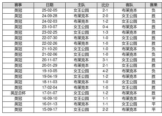 布莱克本 VS 女王公园两队近10年的交战次数为19场,布莱克本11胜3平5负,赢球概率为57.9%,平局概率为15.8%,输球概率为26.3%。