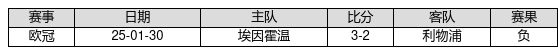 利物浦 VS 埃因霍温两队近10年的交战次数为1场,利物浦0胜0平1负,赢球概率为0.0%,平局概率为0.0%,输球概率为100.0%。