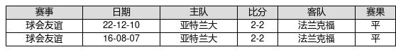 法兰克福 VS 亚特兰大两队近10年的交战次数为2场,法兰克福0胜2平0负,赢球概率为0.0%,平局概率为100.0%,输球概率为0.0%。