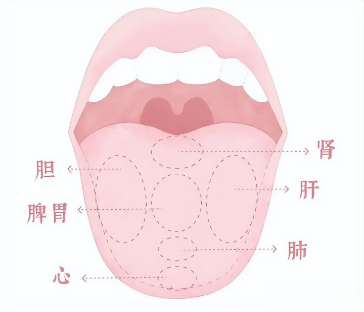 中医将舌头划分为四个区域:舌尖对应心肺,舌中对应脾胃,舌根对应肾,两侧对应肝胆。