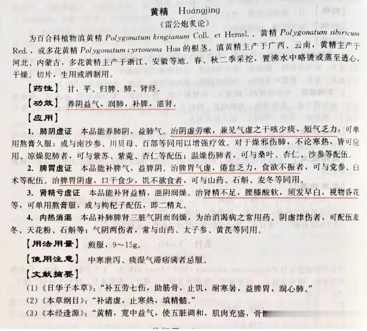 《本草纲目》记载黄精“补诸虚,填精髓”,对各种虚弱之症均有帮助,能同时补益脾、肺、肾三经。