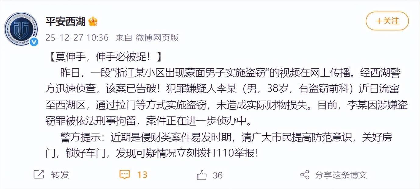 上午10点30分,西湖警方发布通报:昨日,一段“浙江某小区出现蒙面男子实施盗窃”的视频在网上传播。经西湖警方迅速侦查,该案已告破!犯罪嫌疑人李某(男,38岁,有盗窃前科)近日流窜至西湖区,通过拉门等方式实施盗窃,未造成实际财物损失。目前,李某因涉嫌盗窃罪被依法刑事拘留,案件正在进一步侦办中。