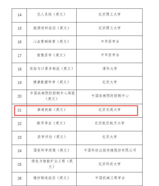 为贯彻落实《关于深化改革培育世界一流科技期刊的意见》和《关于加强北京市高水平国际科技期刊建设的若干措施》,切实培育一批世界一流科技期刊,北京市科协开展“首都科技期刊卓越行动计划”项目申报,其中包括专业期刊集群试点项目和北京地区高水平中英文单刊项目。重点英文期刊征集“北京地区近年来入选中国科协卓越期刊行动计划的高起点新刊和海外回归试点期刊”。要求聚焦首都重大战略需求、重点学科和产业领域,持续强化围绕基础研究前沿、重大应用研究抢抓顶级学术成果的能力,加快跻身世界一流科技期刊行列。经材料申报和答辩评审,《高速铁路(英文)》成功入选。