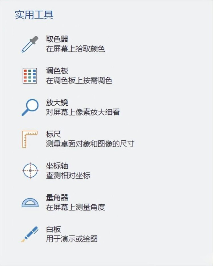 除了截图和编辑功能,PicPick还内置了一系列实用小工具:屏幕取色器(快速获取屏幕上任意颜色的RGB、HEX等颜色值)、屏幕放大镜(放大屏幕局部区域,方便查看细节)、像素标尺(测量屏幕上对象的像素尺寸)、量角器(测量屏幕上的任意角度)以及白板功能(在屏幕上自由绘画、标注,适合演示或教学)。