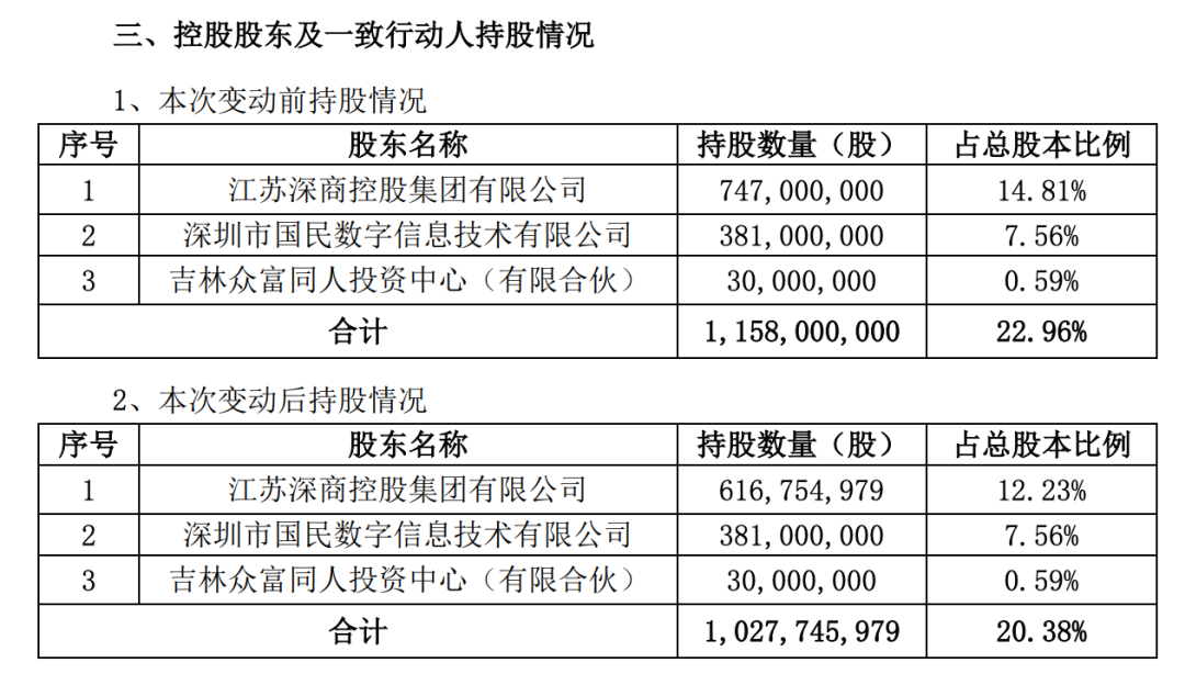 同日,众泰汽车发布公告,公司于近日收到吉林省长春市中级人民法院执行通知书。该通知书提示公司控股股东江苏深商控股集团有限公司(简称“江苏深商”)持有的公司1.3亿股(占公司总股本2.58%)将被司法拍卖。本次执行完毕后江苏深商将持有公司股份6.17亿股(占公司总股本12.23)。本次股份变动不会使公司控股股东发生变化,不会对公司的治理结构和经营情况产生影响。据了解,目前江苏深商为众泰汽车第一大股东,持股12.23%,深圳市国民数字信息技术有限公司 持股7.59%。