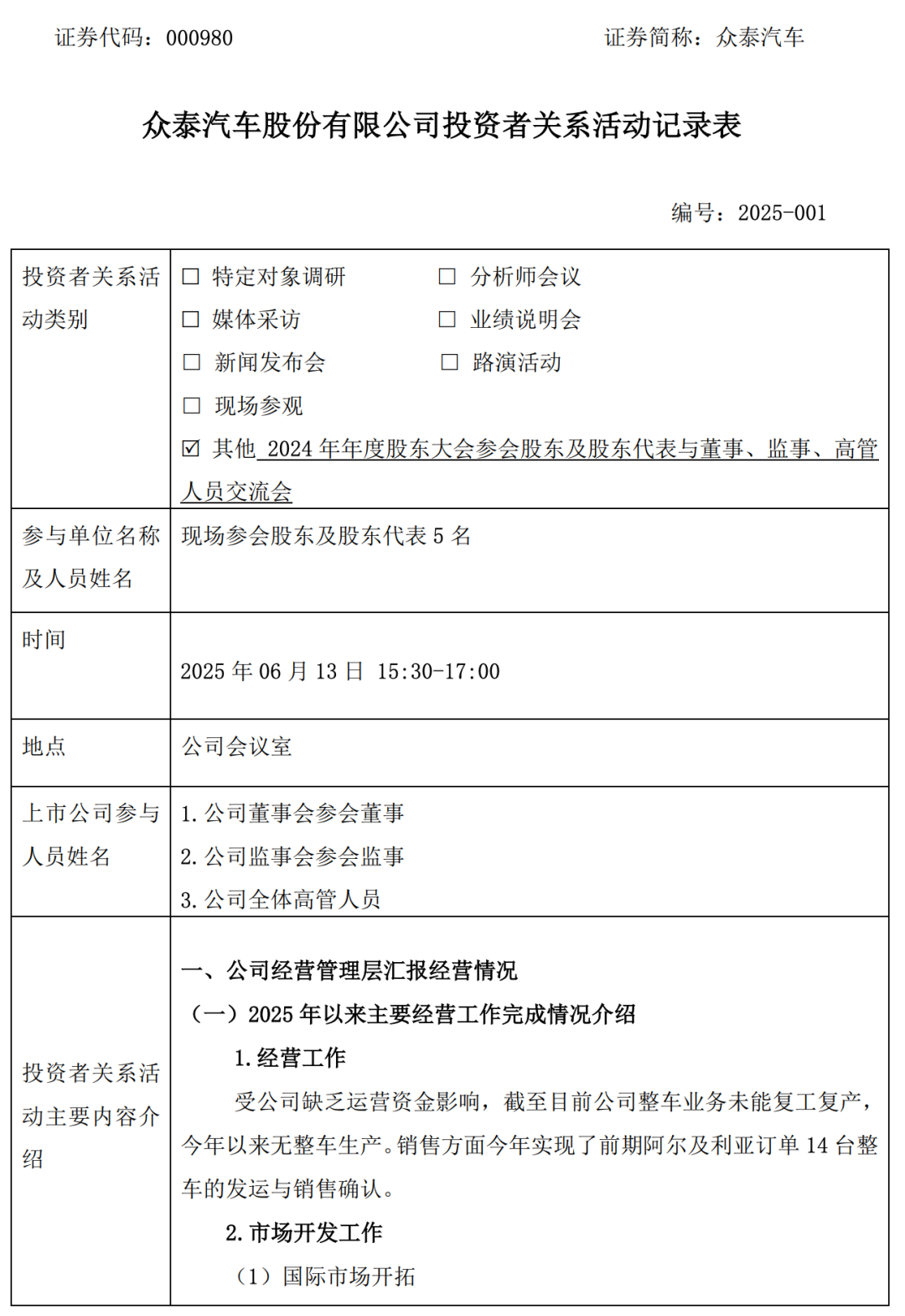 6月17日,众泰汽车发布公告称,由于公司缺乏运营资金影响,截至目前公司整车业务未能复工复产,今年以来无整车生产,仅完成14台阿尔及利亚订单的发运与销售确认。众泰汽车表示,目前公司无法按2021年重整计划规定公开处置重整专户剩余股票,以获得公司运营急需的启动资金,公司当前面临的最大问题是缺少经营所需启动资金,而解决资金的关键点在于协调二股东浙商银行解除对公司重整专户股票及现金账户的司法冻结,公司将继续与浙商银行协商解决措施。公告预警称,若2025年不能复工复产,将严重影响公司的财务状况和持续经营能力,公司将面临今年末净资产为负数而引发的财务风险、经营危机、退市风险。