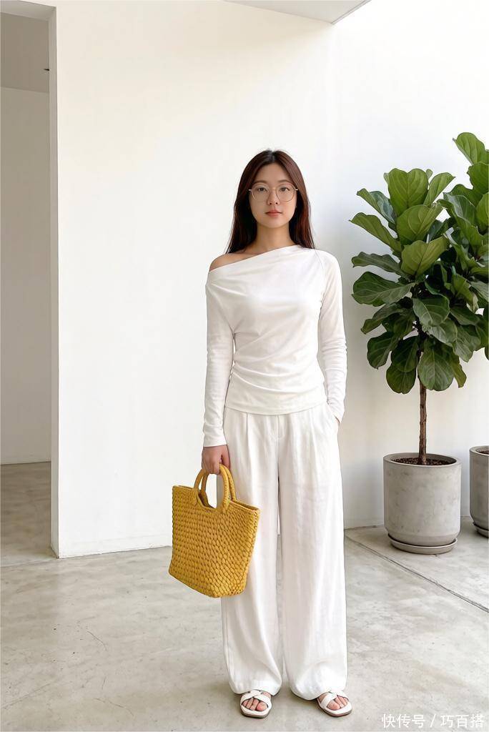 除此之外,大家也可以尝试白色紧身正肩T恤搭配白色高腰拖地阔腿裤,也能利用上紧下松模式展示纯欲氛围,身材凹凸感强的姐妹选择,效果更上一层楼。