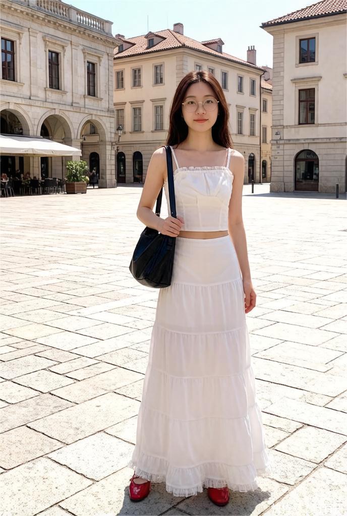 白色紧身露脐款吊带背心搭配纯白色高腰及踝半裙,公主范十足。