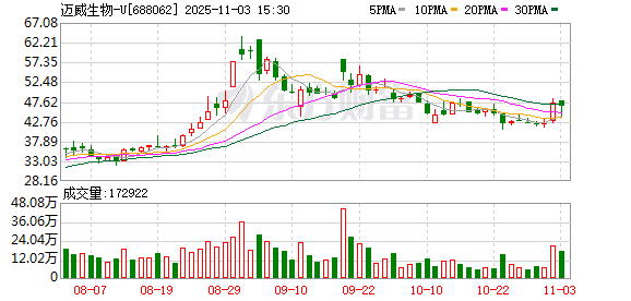 11月3日,迈威生物(688062)发布公告,截至2025年10月31日已回购44万股,占总股本的0.11%,回购资金总额为2070万元,回购价格区间为40.61元/股至58.02元/股。